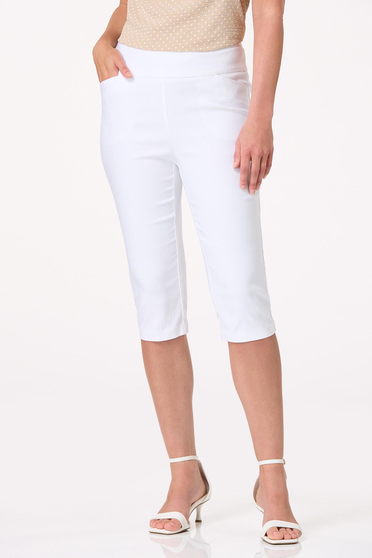 We're keeping the conversation light with this stretchy style, featuring a pull-on waist, slimming style, comfortable, high-rise waist and a bright shade of white for a look that can be perfectly paired with graphic tees or your favorite prints for a fancier feel.